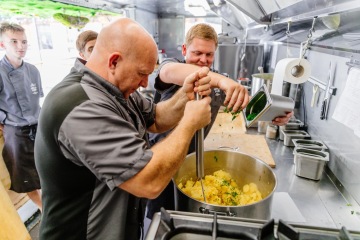 Jedná se o profesionálně vybavenou kuchyni na kolech, která nám poskytuje stejné zázemí, jako kuchyně v restauraci. Díky tomu jsme schopni dojet kdykoliv kamkoliv a uvařit cokoliv až pro 1000 lidí.
